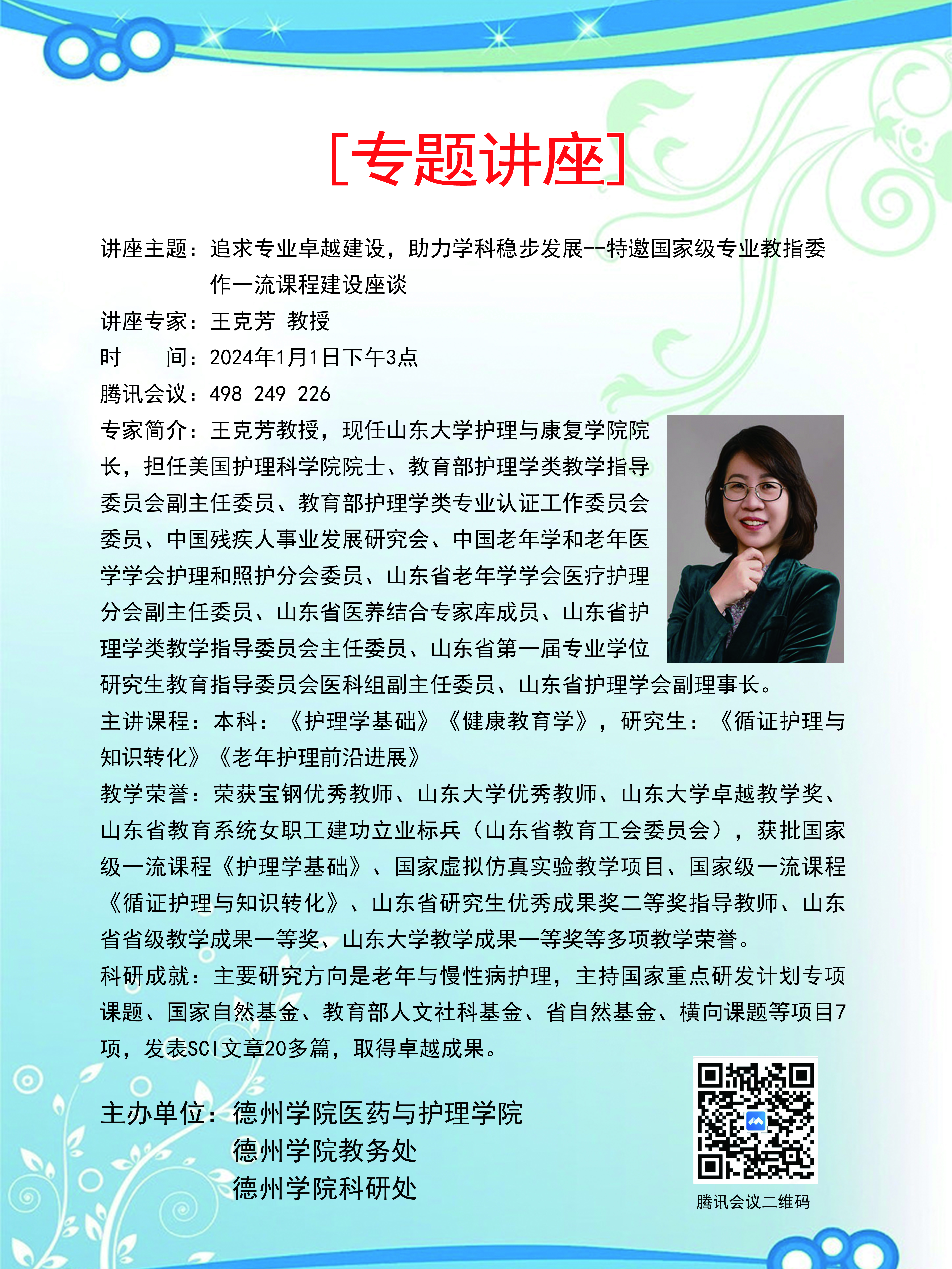 为进一步做好课程建设及教学改革工作,提高护理教育教学质量,2024年1月1日下午,应太阳成城集团医药与护理学院邀请,山东大学护理与康复学院院长王克芳教授通过线上的方式,以“强化教学改革、建设优质课程”为主题,从教学改革的来源和去向、教学创新点的实施与评价、课程建设的思路等方面进行报告,并与参会教师进行充分的交流与讨论。医药与护理学院教学工作负责人、护理系教师参加。