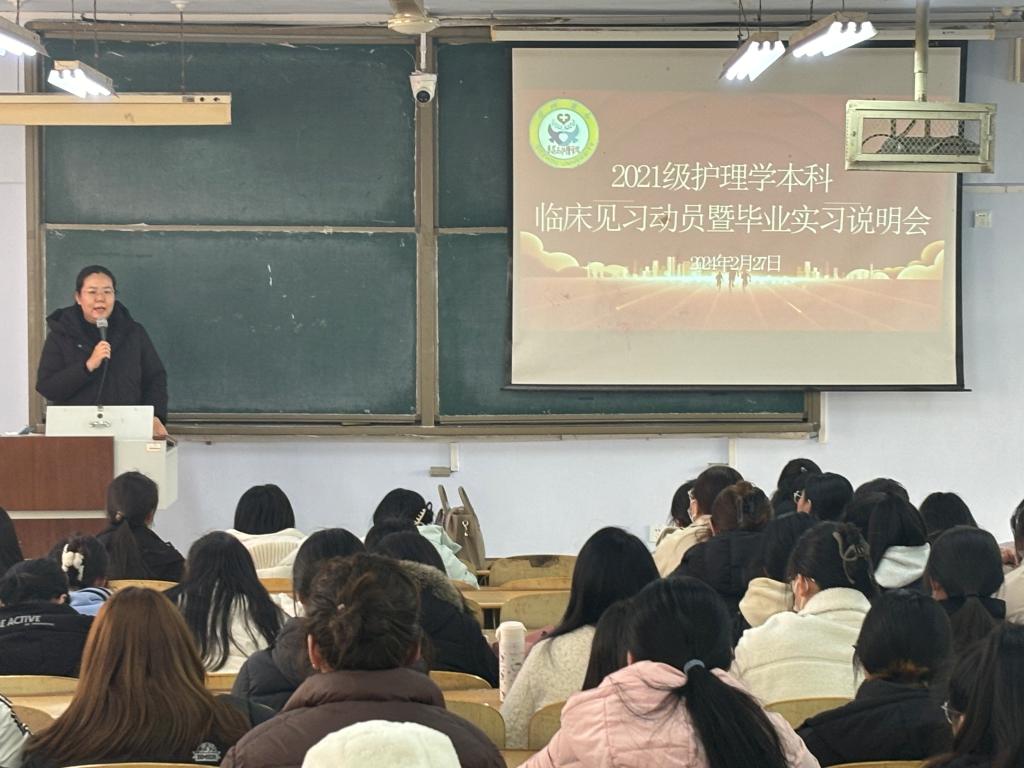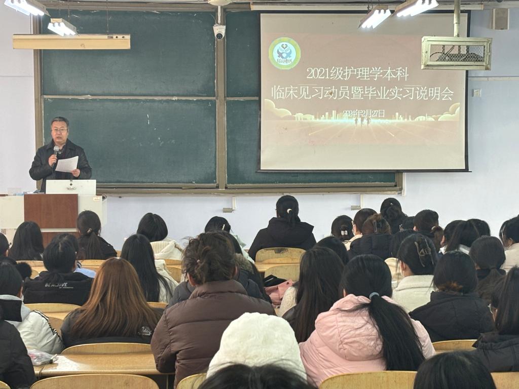 2024年2月27日下午,医药与护理学院2021级护理学本科临床见习动员暨毕业实习说明会在求实楼0214教室召开。会上,实习实践负责老师对本学期临床见习工作进行了安排,并对毕业实习工作进行了细致的讲解。
