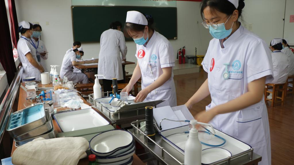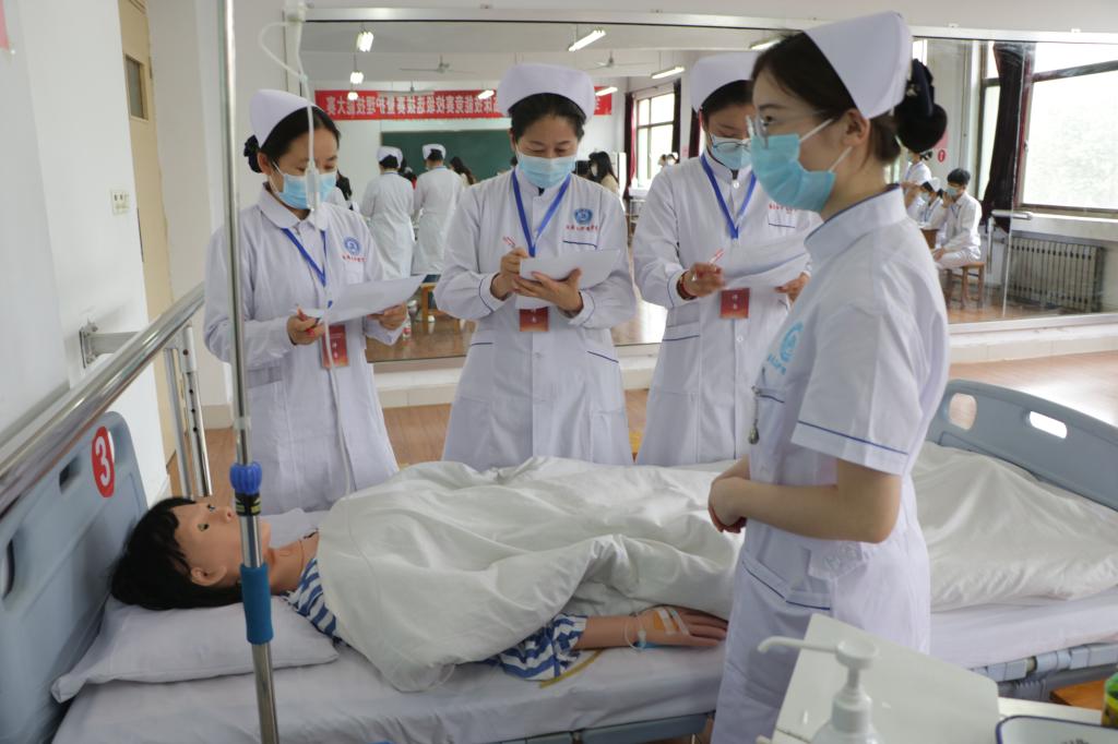 评委们认真查看同学们的比赛状况,细心指出操作中的问题,并强调护理技能操作一定要贴近临床、关注患者、注重沟通、重视人文,才能为患者提供优质护理服务。