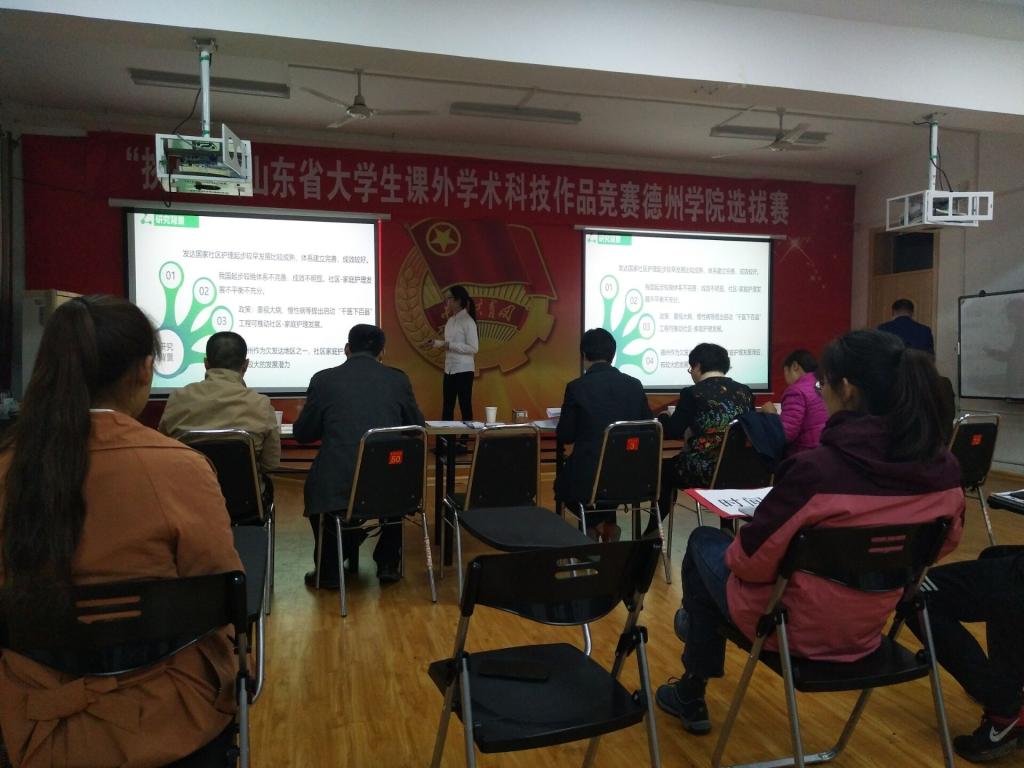 本次“挑战杯”入围的竞赛作品分为ABC三类,涉及能源化工、生命科学、机械与控制、信息技术、医疗卫生服务等多学科门类,共计约60余项目。经过赛前的认真准备和老师的精心指导,参赛选手们淋漓尽致地展现着他们的创新创业成果。我院选手刘晓光、丁文成等以《社区-家庭护理现状研究调查报告—以德州市为例》的项目获得专家的一致好评。