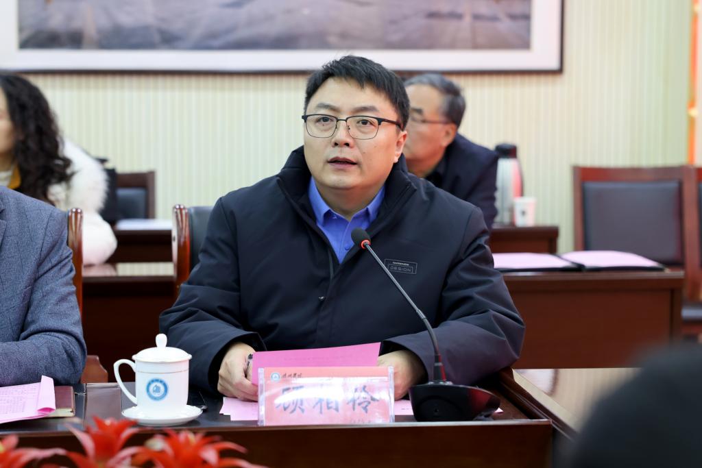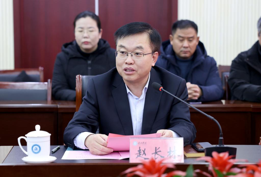 赵长林致辞,他向大会的召开表示祝贺,向长期以来支持学校事业发展的领导、嘉宾的到来表示欢迎和衷心的感谢,向共建单位表示真诚敬意。赵长林介绍了学校办学历史况和事业发展情况,重点介绍了学校深入推动产教融合、服务地方经济社会发展情况。他说,山东大学齐鲁医院德州医院与我校共建现代医药产业学院,是服务国家医药产业高质量发展战略和区域医药产业对科技、人才需求的务实举措。希望双方按照共建共享、资源融合、互利双赢的原则,坚持项目化、平台化运行,聚焦德州中医药、功能性食品产业发展需求和医工交叉融合、智能医疗、智改数转等领域,强化特色,形成优势,协同育人,共同将太阳成城集团现代医药产业学院打造成育人成效显著、服务区域医药产业能力强、产学研用联动机制成果显著、在省内有较强影响力的现代产业学院,为德州和山东医药健康产业提供有力的人才支持和智力支撑。
