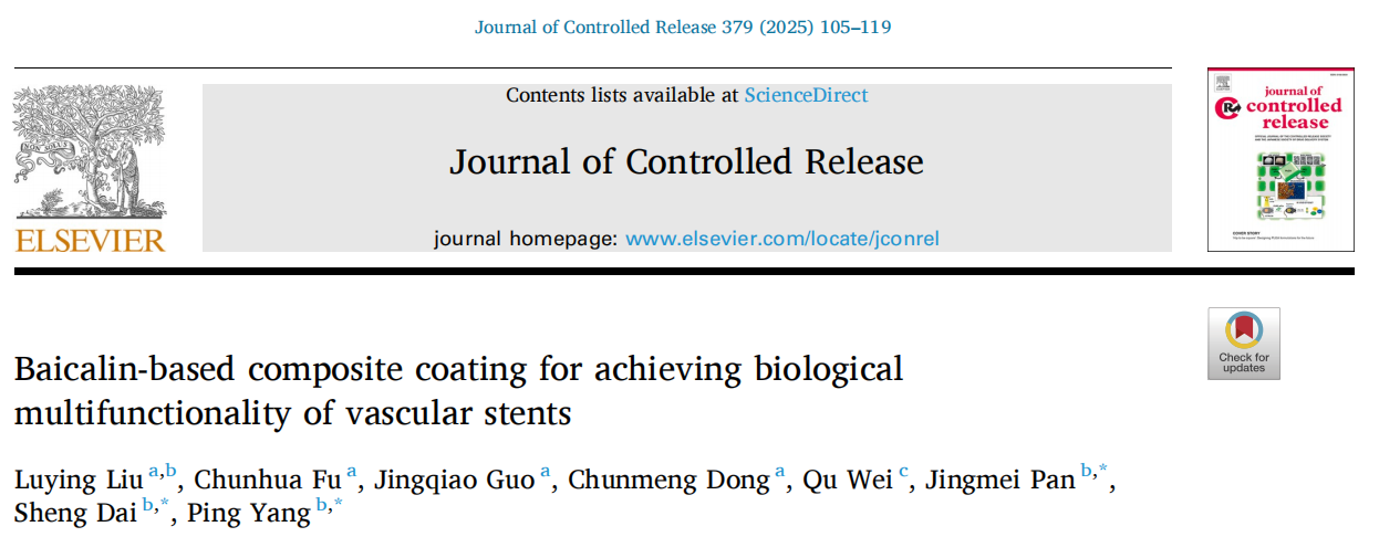 近日,我校suncitygroup太阳成集团博士团队成果以“Baicalin-based composite coating for achieving biological multifunctionality of vascular stents”为题发表在药物递送领域国际著名期刊《Journal of Controlled Release》(IF10.5,一区TOP期刊)上。该成果第一作者为suncitygroup太阳成集团刘鲁英博士,第一完成单位为太阳成城集团,通讯作者为西南交通大学医学院杨苹教授。