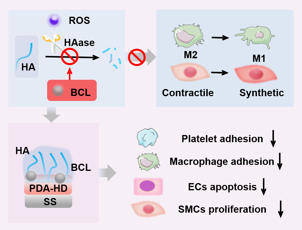 该成果构建了一种用于入冠状动脉支架的黄芩苷多功能分子复合涂层。针对动脉粥样硬化性心血管疾病使用的支架植入部位病理微环境活性氧水平升高和透明质酸酶表达增加的问题,基于可调控氧化应激的黄芩苷多功能分子提出并构建了一种共固定黄芩苷和透明质酸的复合涂层,成功实现了黄芩苷和透明质酸的协同作用。涂层表面固定的黄芩苷可降低活性氧水平并抑制透明质酸酶活性,防止表面透明质酸降解,减少巨噬细胞向促炎表型的转变和平滑肌细胞向合成表型的转变。黄芩苷在氧化应激环境中保护内皮细胞,促进内皮化,并降低组织中的透明质酸酶表达水平以增强组织稳定性,实现了黄芩苷和透明质酸之间的协同作用。黄芩苷和透明质酸的协同作用不仅限于血管支架涂层的应用,可扩展到透明质酸相关的其他生物材料,是一种具有广泛潜在应用的新策略。