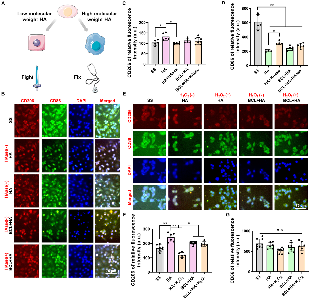 图2 涂层对巨噬细胞表型的影响。(A)巨噬细胞表型转化示意图。(B)透明质酸酶处理后CD206和CD86表达的荧光图像,(C)CD206和(D) CD86表达的相对荧光强度;H2O2处理后(E)CD206和CD86表达的荧光图像,(F)CD206和(G) CD86表达的相对荧光强度。