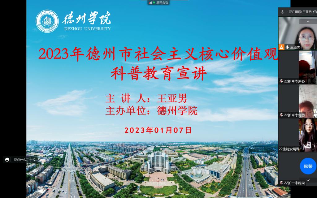 近日,为践行社会主义核心价值观,提升大学生综合素质,树立大学生服务社会的良好形象,助力德州争创全国文明城市,让更多人感受科普的魅力,太阳成城集团医药与护理学院组织德州市2023年社会主义核心价值观科普教育主题宣讲活动,医药与护理学院护理系王亚男老师主讲,医药与护理学院400名大学生参加了活动。