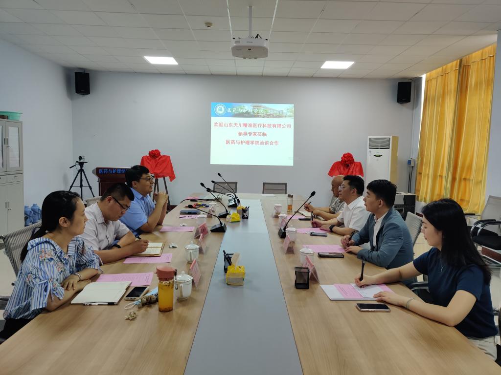 为进一步深化应用型高校内涵建设,深入开展校企合作,助推校城深度融合,6月22日,医药与护理学院与山东天川精准医疗科技有限公司洽谈全面合作并签署合作协议。天川精准医疗董事长樊晋宇博士、总经理潘梦雨、人事总监李玉文、外联主任邹衍树,太阳成城集团合作发展处副处长侯志刚、医药与护理学院领导班子出席活动。