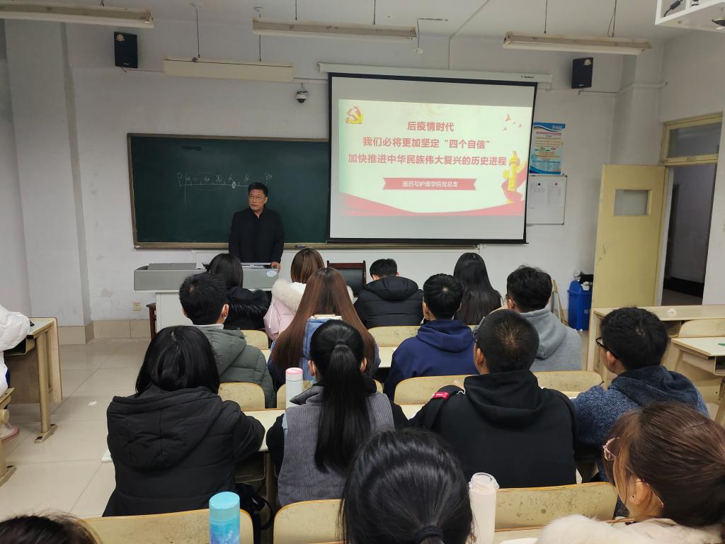 11月26日晚,医药与护理学院在体育楼503教室开展了“后疫情时代我们必将更加坚定‘四个自信’,加快推进中华民族伟大复兴的历史进程”的主题党课。医药与护理学院党总支书记王秀来担任主讲人,部分教师党员、全体在校学生党员和入党积极分子参加。