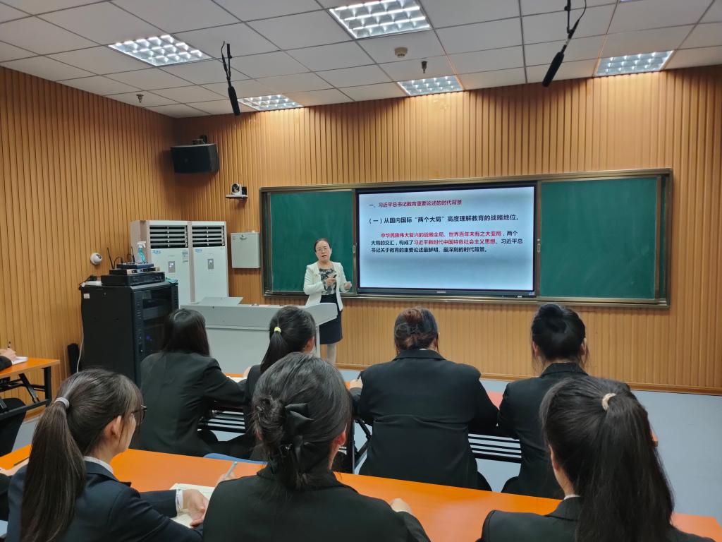 党课围绕习近平总书记教育重要论述,分别从时代背景、战略意义、思想精髓、时代使命四个方面深刻阐述了“为谁培养人、培养什么人、怎样培养人”这一教育的根本问题。徐静校长指出,作为新时代青年学子,生逢其时,施展才干的舞台无比广阔,实现梦想的前景无比光明。一定要认真学习贯彻习近平总书记关于教育的重要论述,树立对马克思主义的信仰、对中国特色社会主义的信念、对中华民族伟大复兴中国梦的信心,要肩负起历史使命,坚定前进信心,立大志、明大德、成大才、担大任,努力成为堪当民族复兴重任的时代新人,把青春奋斗的热血写在历史丰碑上,为全面建设社会主义现代化国家、全面推进中华民族伟大复兴作出新贡献。