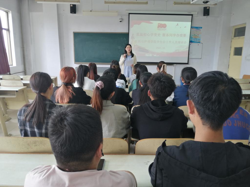 2021年4月20日下午,医药与护理学院学生会于体育楼503教室开展了“重温初心学党史 服务同学办实事”主题培训会,团总支书记主持,辅导员及全体学生会工作人员参加。