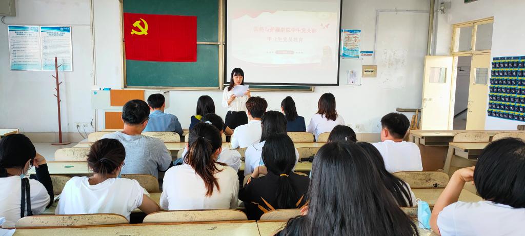 2022年6月10日,医药与护理学院在体育楼414教室举办2022届毕业生党员“最后一次党课”。学院党委副书记以“砥砺奋进明初心,青春使命勇担当”为题给学生们授课,学生党支部书记、辅导员,全体毕业生党员参加学习。