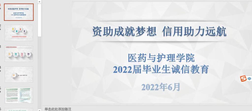 为做好生源地信用助学贷款宣传工作,加强毕业生诚信教育,提高广大学生征信意识、风险意识、法律意识,6月8日下午,医药与护理学院举办2022届毕业生诚信教育线上会议。本次会议由辅导员李艳龙老师主讲,2022届毕业生参加。