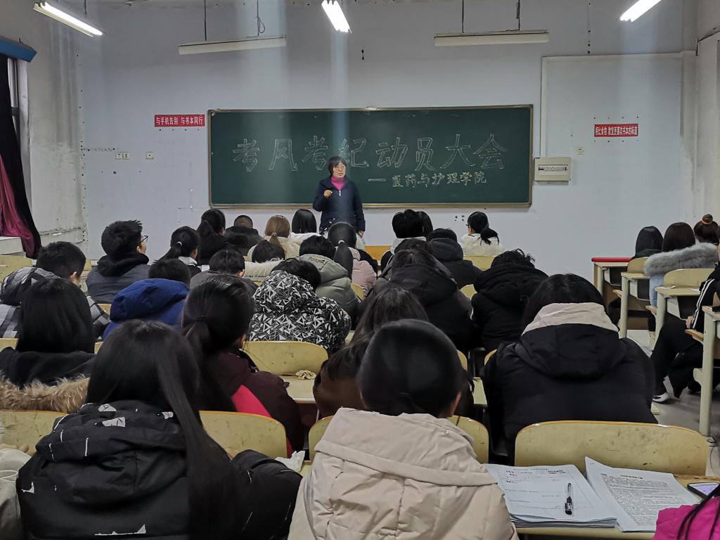 为进一步加强诚信考试教育,强化同学们的诚信应考意识,倡导同学们以实力争取优异成绩,以诚信展现良好学风。医药与护理学院于2019年12月24日下午在求索楼4001教室召开了考风考纪动员大会。会议由学生会相关部门主持,党总支副书记孟爱青老师出席会议并发表讲话,团总支全体老师、院全体学生干部参加。
