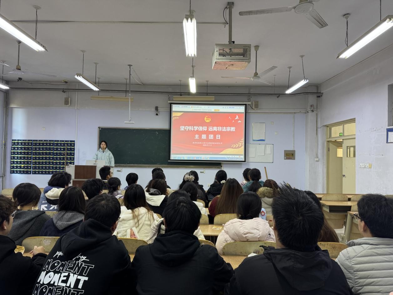各团支部聚焦党的宗教政策,通过专题宣讲、图文解读等多元形式,组织学习《识别非法宗教活动宣传手册》。团支书通过典型案例剖析,指出非法宗教活动的隐蔽性与危害性,提炼出“不听、不信、不传”的实用防范准则,引导青年团员远离非法宗教。围绕“校园宗教安全责任”“青年如何抵御非法宗教渗透”等话题,大家结合专业学习与生活实际积极交流发言,分享防范经验,现场讨论氛围热烈浓厚。