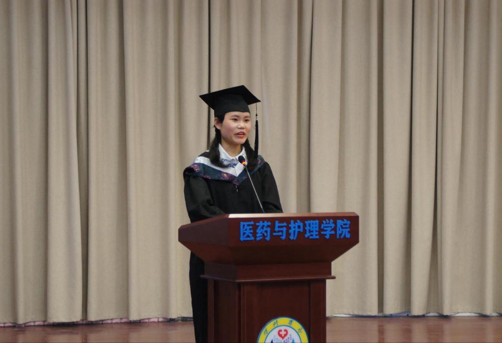 顾相伶说,在将来,成功时鲜花簇拥的背后,请不要忘记母校和我们引以为豪的眼神;失意时孤单无助的阴影下,请不要忘记母校和我们信任期盼的目光。期望同学们满怀信心地奔赴人生新的旅程,承担起更加繁重的使命和责任,继续发扬“崇德启智、励志博学”的校训,续写医药与护理学院辉煌的篇章,和母校同成长,与母校共辉煌。