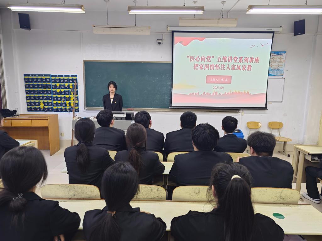 为进一步弘扬中华优秀传统文化,推动家风家教建设,激发党员干部及学院师生的爱国情怀,医药与护理学院于2023年9月12日开展了“医心向党”五维讲堂系列讲座之把家国情怀注入家风家教。第一学生党支部宣传委员张鑫主讲,教师党员和第一学生党支部全体党员参加。
