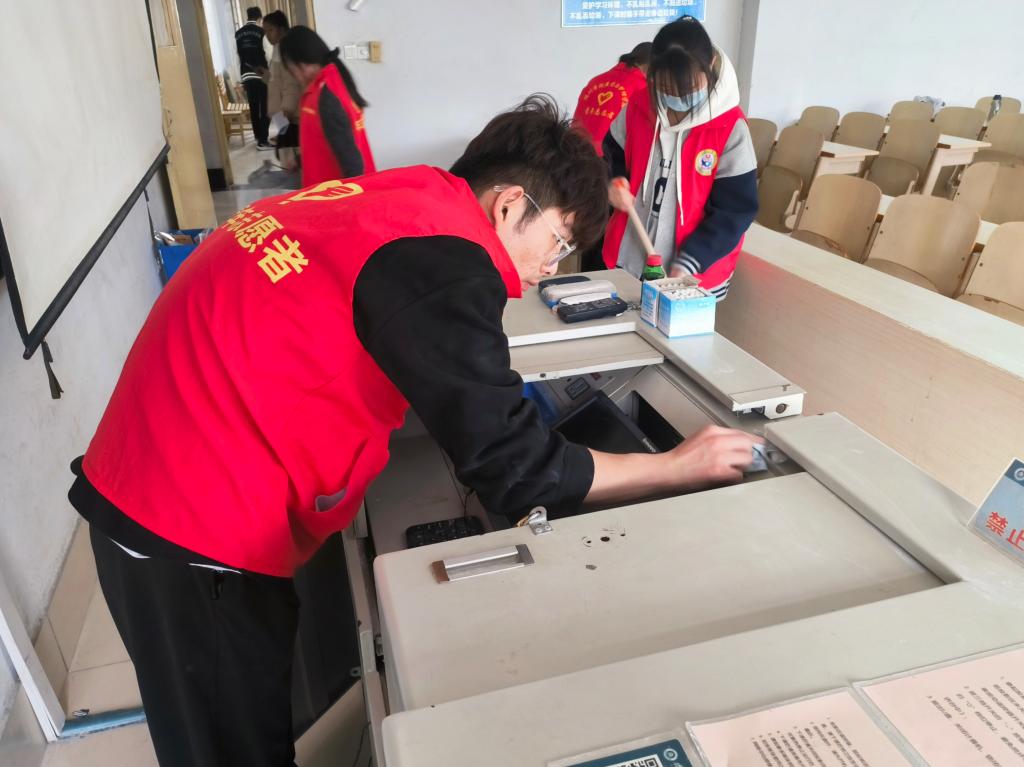 活动过程中,志愿者按照活动前期任务分配,四人一组前往各自任务区展开活动。志愿者成员们手拿垃圾袋扫把等卫生工具一丝不苟的清洁着每一间教室。从讲台到角落,志愿者们以认真的态度,高质量的完成着任务志愿者们不说苦,不喊累的良好精神风貌为生机盎然的春天增添了一份份活力。